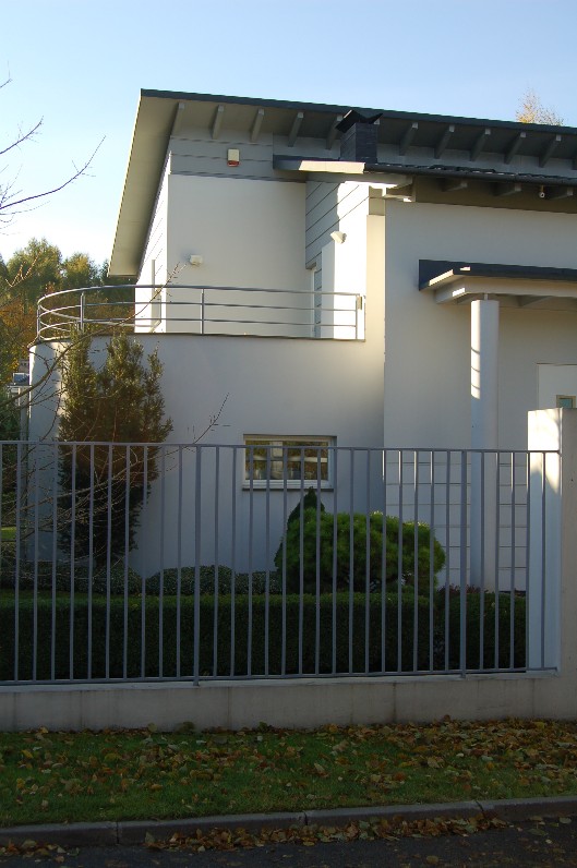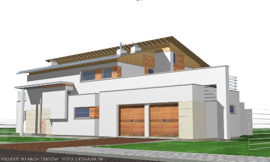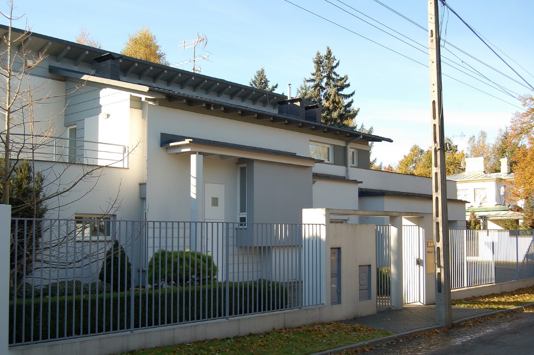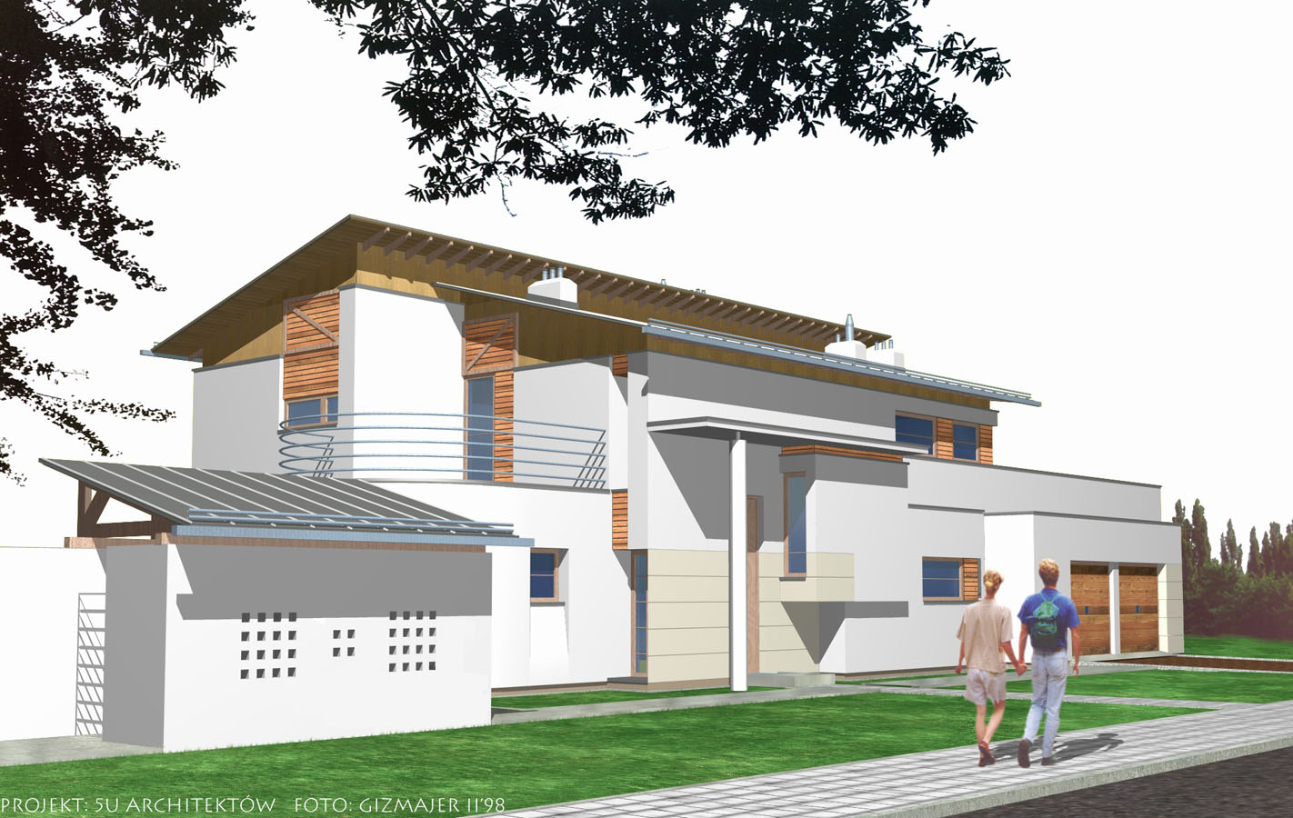 Dom powstał na warszawskich Młocinach, w czasach, kiedy jedynym punktem odniesienia był pobliski kościół, bo wokół szumiała trawa na pustych działkach. Teraz trudno znaleźć kawałek pustego placu... Dom ma kształt wydłużomnego prostopadłościanu ustawionego wzdłuż ulicy. Swoją bryłą tworzy parawan zasłaniający ogród od ulicy. Stylistyka domu jest kompromisem pomiędzy wymaganiami Urzędu (rustykalna), a zamierzeniami inwestora (współczesna).